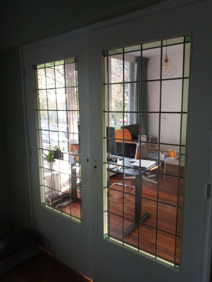 Ob alt oder neu, aus Holz, Stahl oder PVC. Innentüren können Zuglufttüren, Schiebetüren, Badezimmertüren oder Stahltüren sein, die gegebenenfalls mit Oberlichtern kombiniert werden. Der Zweck von Innentüren besteht darin, mehr Licht zwischen verschiedenen Räumen zu lassen, und dieser Zweck kann durch den Einsatz von Buntglas auch dekorativ gestaltet werden. Stil und Design der Innentür sind entscheidend und können durch ein kunstvoll gestaltetes Buntglasfenster aufgewertet werden. Buntglas in Innentüren kann mit anderen Buntglasarten kombiniert werden und in modernen, traditionellen, Jugendstil-, Amsterdamer Schule-, 1930er-Jahre- oder anderen Stilen gestaltet werden. AvD-Glas kann Ihr altes Buntglas in Innentüren restaurieren und verstärken sowie neues Buntglas entwerfen, fertigen, ausmessen und montieren.